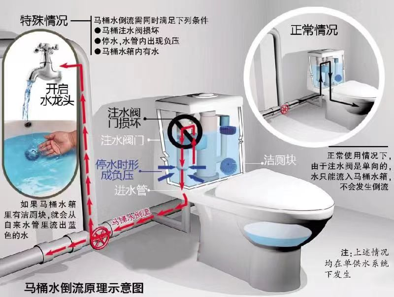 個別用戶發(fā)現(xiàn)從水龍頭中放出的自來水有時會呈現(xiàn)藍色。出現(xiàn)這種現(xiàn)象是因為用戶在廁所水箱內(nèi)放有潔廁靈(藍色),同時馬桶進水管止回閥損壞導(dǎo)致。正常情況下,在管網(wǎng)壓力的作用下,水的流向是正向的。但由于停水或者樓下有用水,在開啟閥門或水龍頭的瞬間,由于水流的突然變化,使樓上未用水的管道內(nèi)產(chǎn)生了瞬時負壓,將水箱內(nèi)的水抽入管道內(nèi),即產(chǎn)生了藍水現(xiàn)象。只需加裝止回閥,即可解決問題。