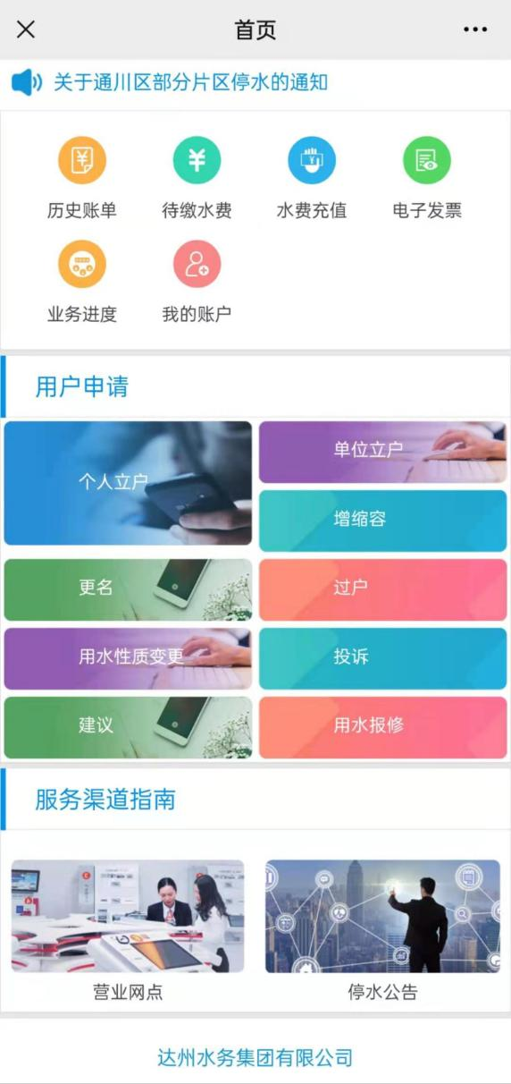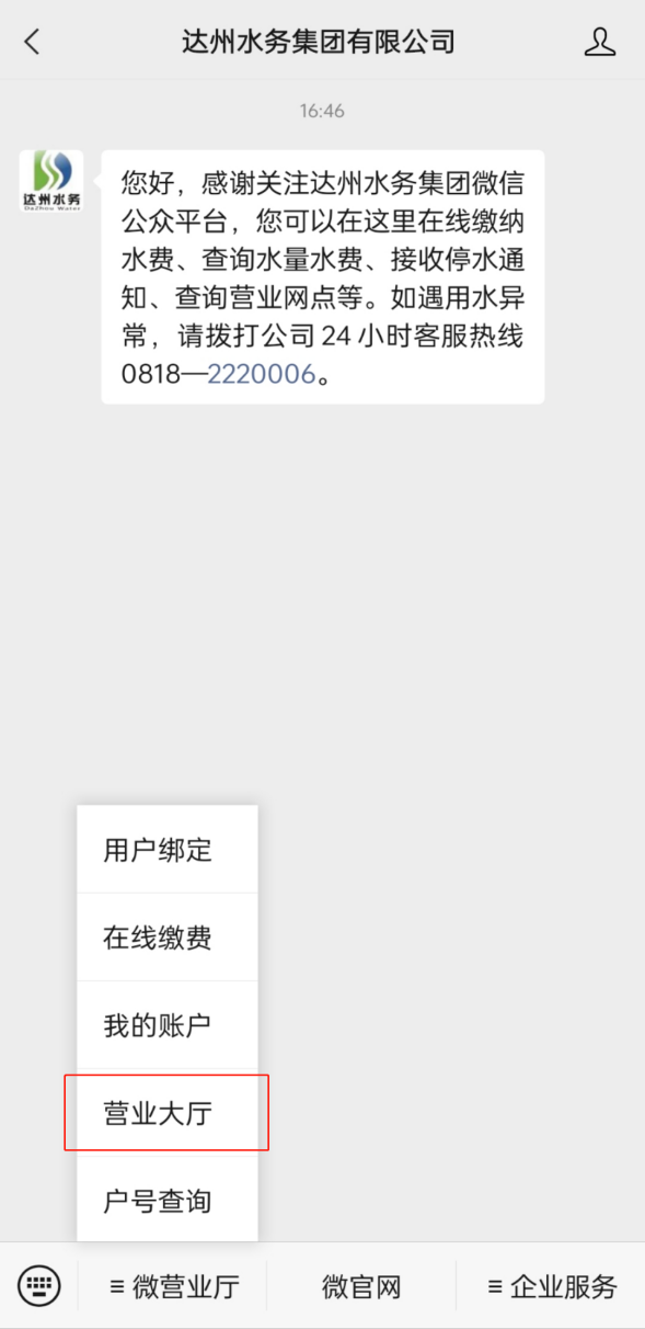 關(guān)注“達(dá)州水務(wù)集團(tuán)有限公司”公眾號(hào),點(diǎn)擊“微營(yíng)業(yè)廳”中的“營(yíng)業(yè)大廳”。