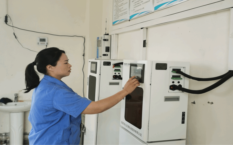 為了確保各個(gè)環(huán)節(jié)污水檢測(cè)指標(biāo)正常,李紅每隔2小時(shí)就對(duì)進(jìn)出口在線(xiàn)監(jiān)測(cè)室的在線(xiàn)設(shè)備、各類(lèi)藥劑進(jìn)行巡視,查看數(shù)據(jù)是否上傳成功,及時(shí)處理應(yīng)急突發(fā)問(wèn)題。水廠占地達(dá)130畝,一遍巡視下來(lái)就會(huì)花上1小時(shí)左右。當(dāng)進(jìn)口取樣管堵塞時(shí),她帶領(lǐng)班組成員積極協(xié)助維修科等工作人員對(duì)取樣設(shè)備進(jìn)行清理。為了減少進(jìn)口監(jiān)測(cè)設(shè)備吸到雜質(zhì)堵塞檢測(cè)設(shè)備的管路,她每隔1-2小時(shí)還要對(duì)進(jìn)水取樣口篩網(wǎng)進(jìn)行沖洗,從來(lái)不怕臟、不怕累。